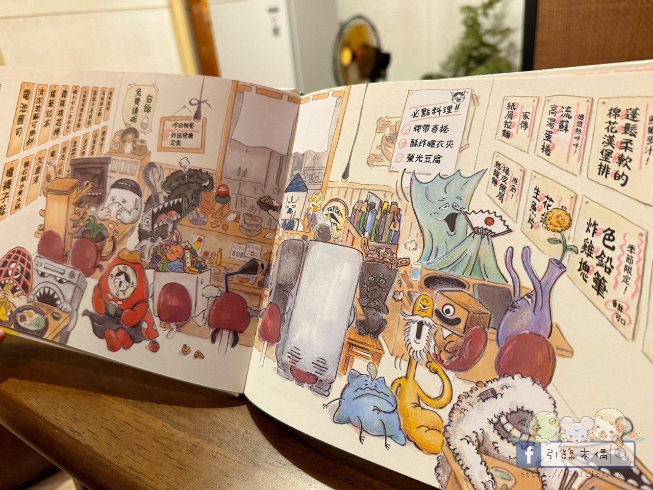 最讓他開懷的,是我模仿妖怪們吃飯的聲音。「電池壽司」咔滋咔滋、「棉花漢堡排」軟綿綿,他笑得直拍床。那一刻,會發現幼兒的快樂有時就是那麼單純。一點聲音的想像,就能讓故事變成立體的世界。