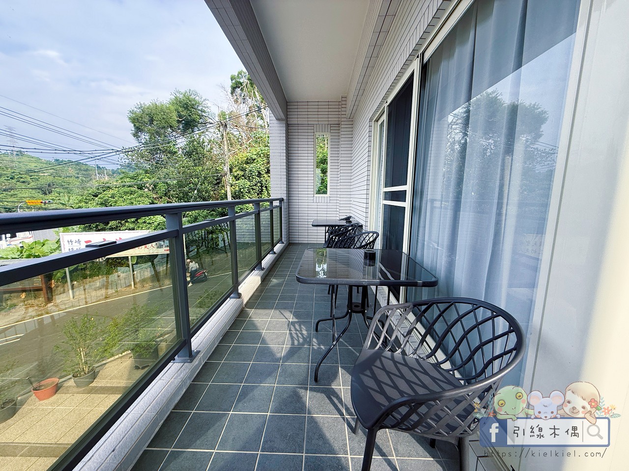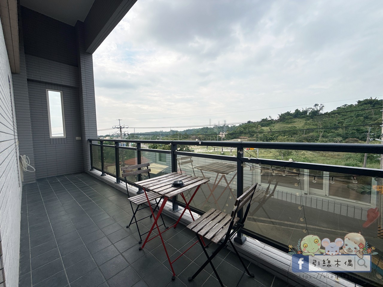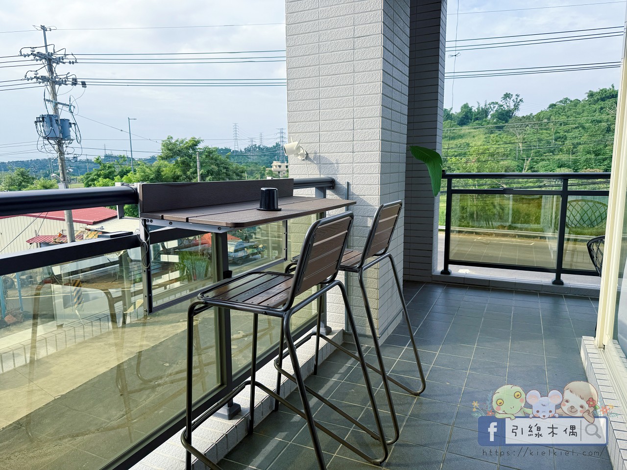 《徐徐民宿》的二樓陽台視野超棒,是環繞整個客廳90度的大陽台,我特別喜歡這裡的開放感,玻璃欄杆讓景色一覽無遺,光線也很柔和,一眼望出去就是整片綠意。有高腳椅跟咖啡椅,早上泡杯咖啡坐著吹風,或傍晚看夕陽都讓人覺得時間變慢了。