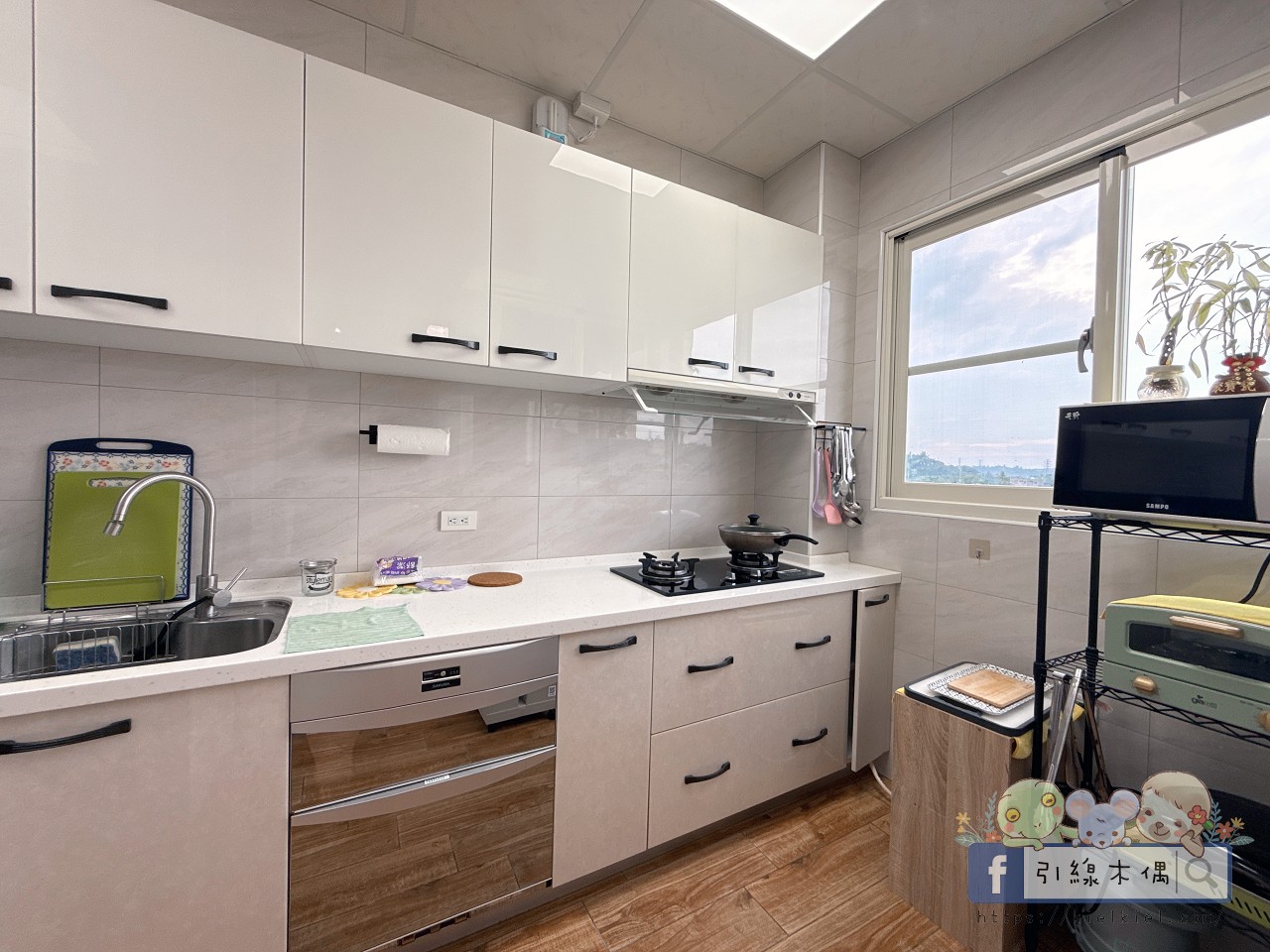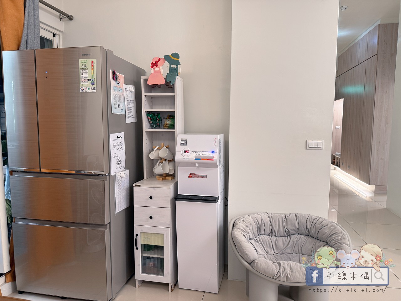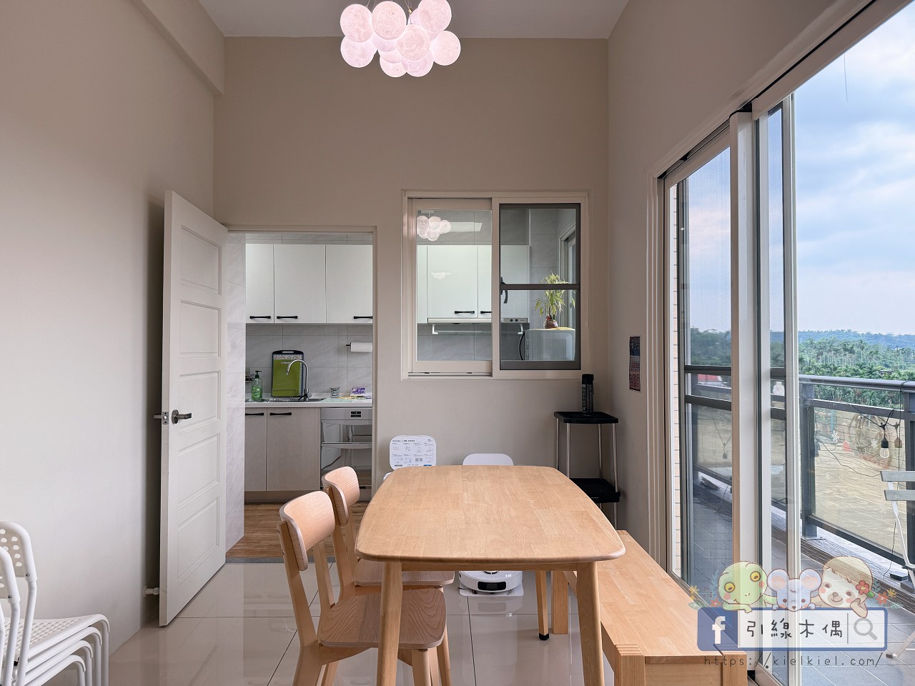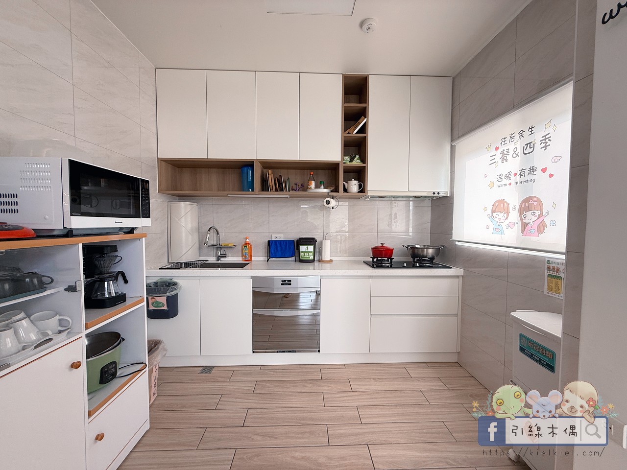 二樓與三樓各有廚房,乾淨又明亮。像我們這次包棟入住,晚上大家想泡泡麵、煮宵夜都超方便。冰箱、微波爐、飲水機、電磁爐通通有,光是看到整排白色櫥櫃就覺得療癒,整體空間很清爽。