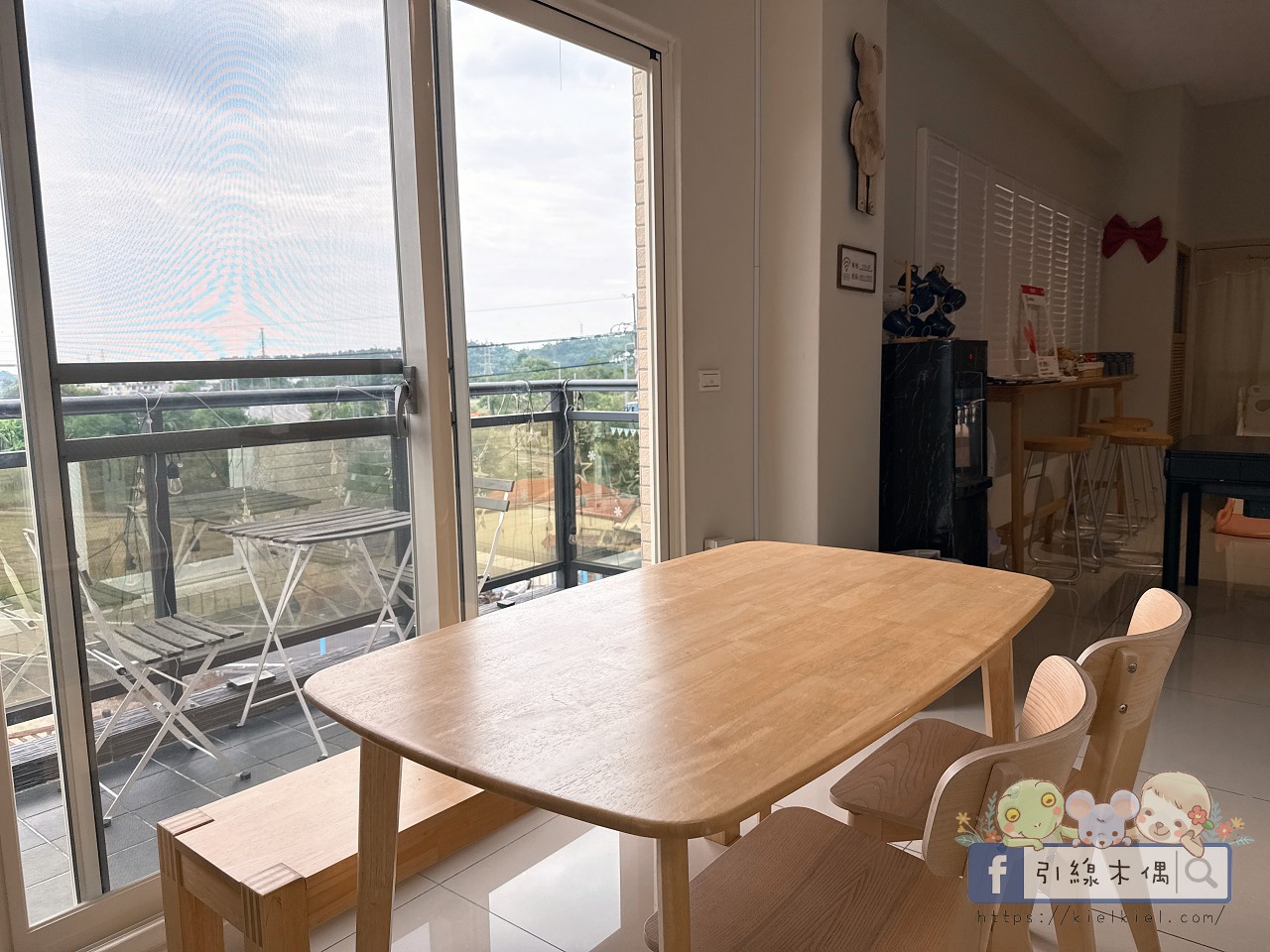 靠窗區還有吧檯桌與高腳椅,陽光灑進來的時候特別漂亮,坐在那裡喝咖啡、看風景很愜意。動線流暢又溫馨。晚餐後我們就在這裡邊聊天邊玩小遊戲,笑聲此起彼落。這層樓的氛圍,讓人有種不只是住宿,而是一起生活的感覺。