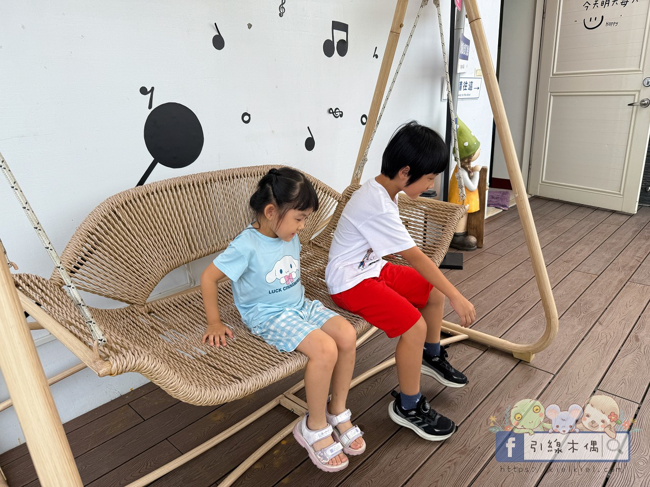 前方的小庭園整理得乾乾淨淨,綠草坪搭配木台雅座與雙人搖椅,午後陽光灑落時,坐在那裡喝咖啡、聊天都特別愜意。整體空間不僅舒適開闊,也營造出放鬆的家庭氛圍。