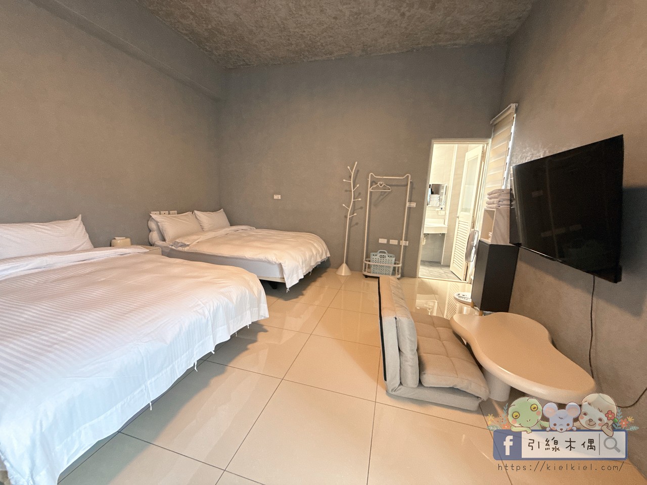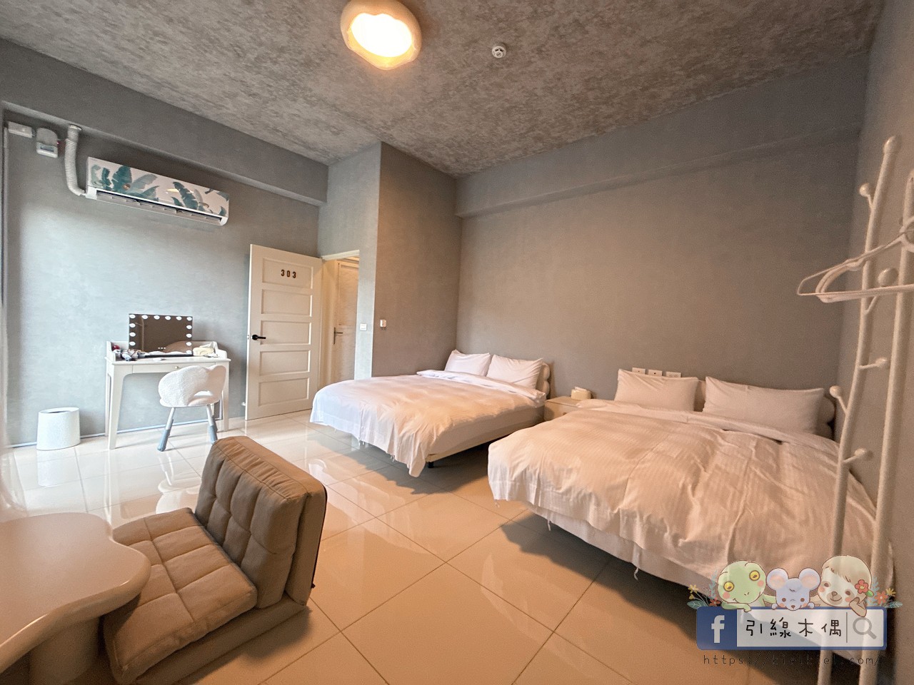 303四人房是小姑一家住的房型,整體走的是時尚灰色調,簡約又有質感。兩張大床睡起來很舒服,還有小沙發區可以放鬆聊天,空間感十足。牆面與天花板的灰色搭配白色床鋪,看起來像精品飯店一樣俐落。