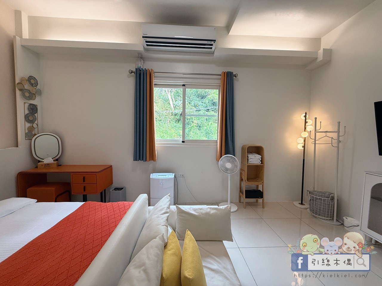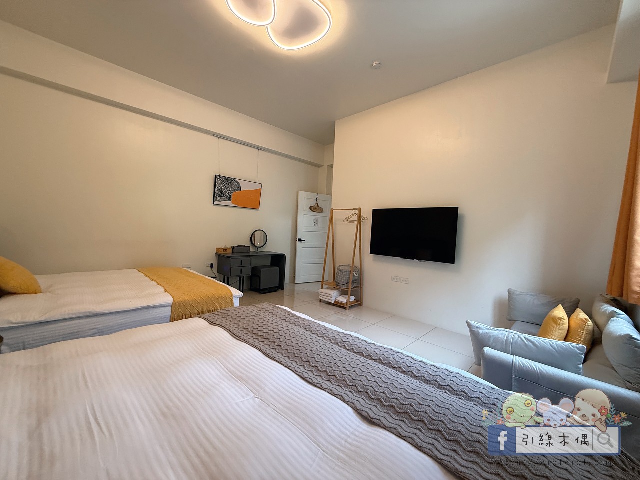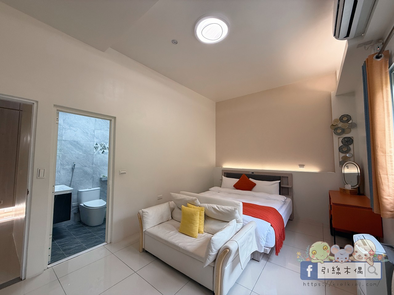 房間空間很大、採光又好,早上陽光灑進來的時候,整個房間亮得像開了柔光濾鏡。粉橘色梳妝椅、圓燈吊飾都很有設計感,浴室乾淨明亮、乾濕分離。好友說住起來超舒服,整體氛圍溫馨又活潑,是那種一進門就會覺得「啊~這裡好可愛喔」的房型。