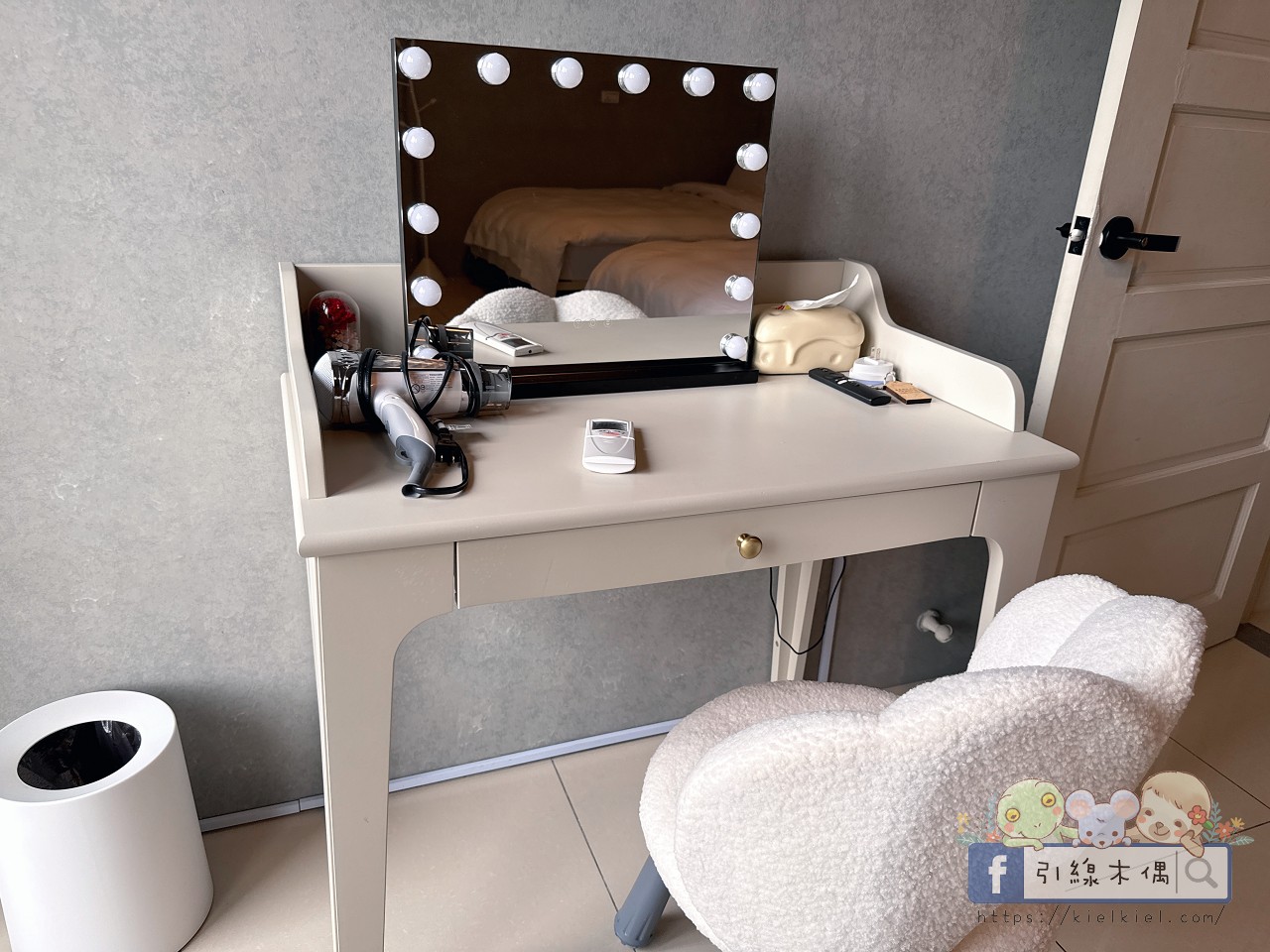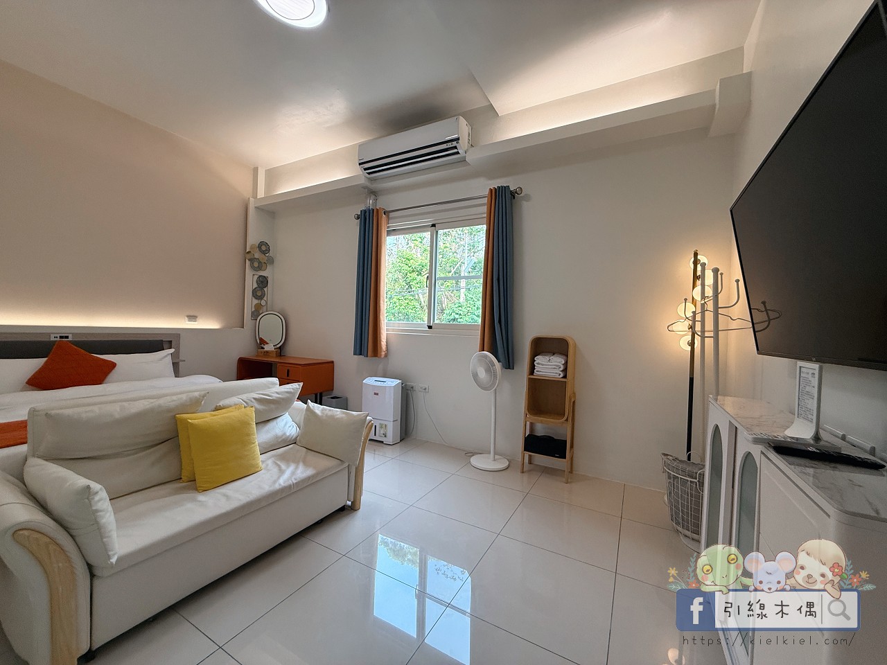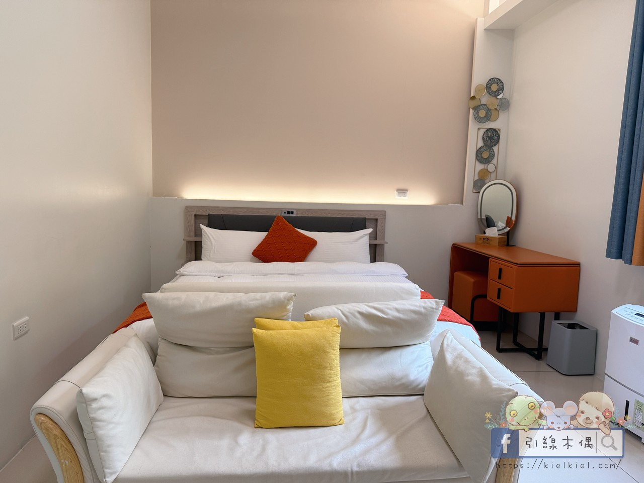 房間空間很大、採光又好,早上陽光灑進來的時候,整個房間亮得像開了柔光濾鏡。粉橘色梳妝椅、圓燈吊飾都很有設計感,浴室乾淨明亮、乾濕分離。好友說住起來超舒服,整體氛圍溫馨又活潑,是那種一進門就會覺得「啊~這裡好可愛喔」的房型。