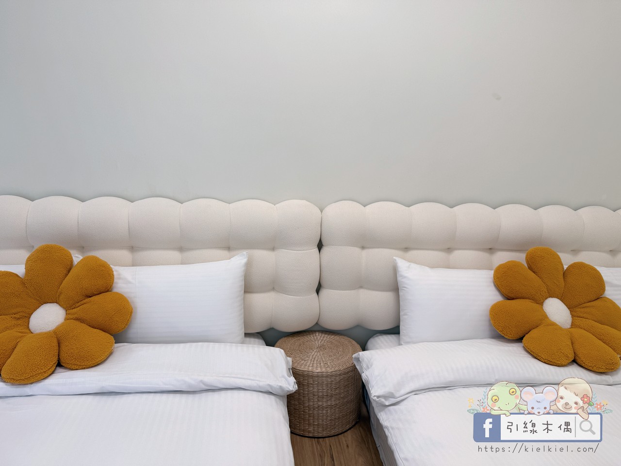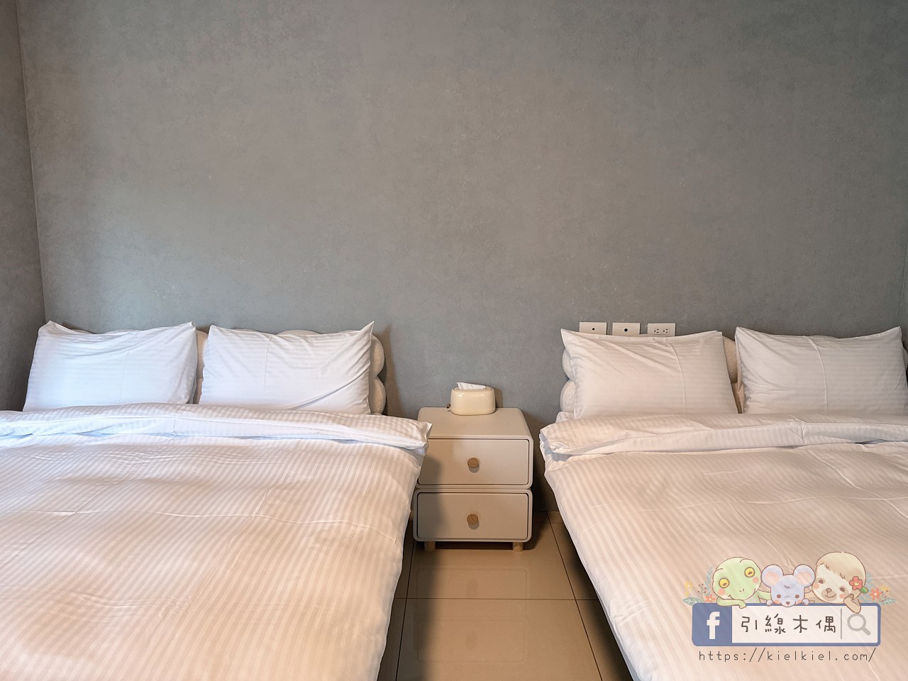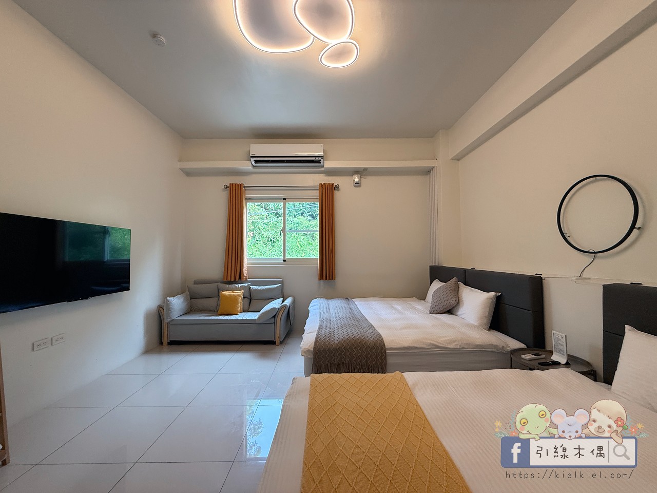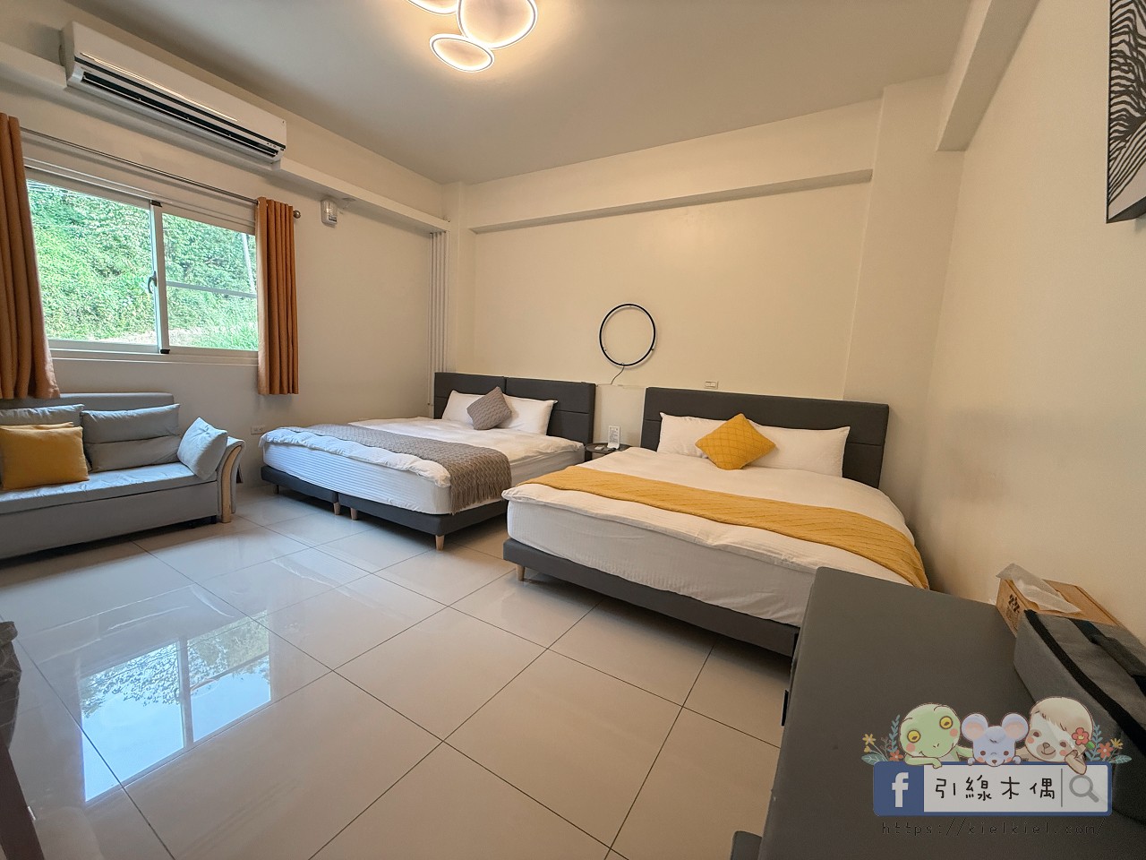 201四人房是這次爺爺奶奶的房間,一走進去就覺得空間好寬敞。兩張大床柔軟乾淨,牆面和床品配色都很溫柔,簡約中又帶點溫度。窗外的綠意灑進來,白天採光極好,整個房間都亮亮的,看起來特別清爽。