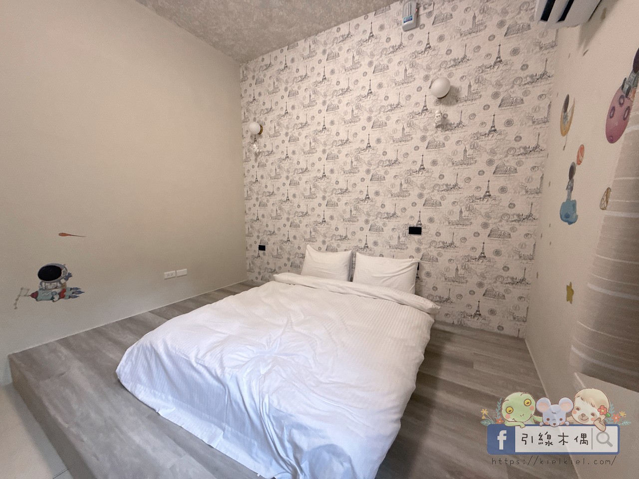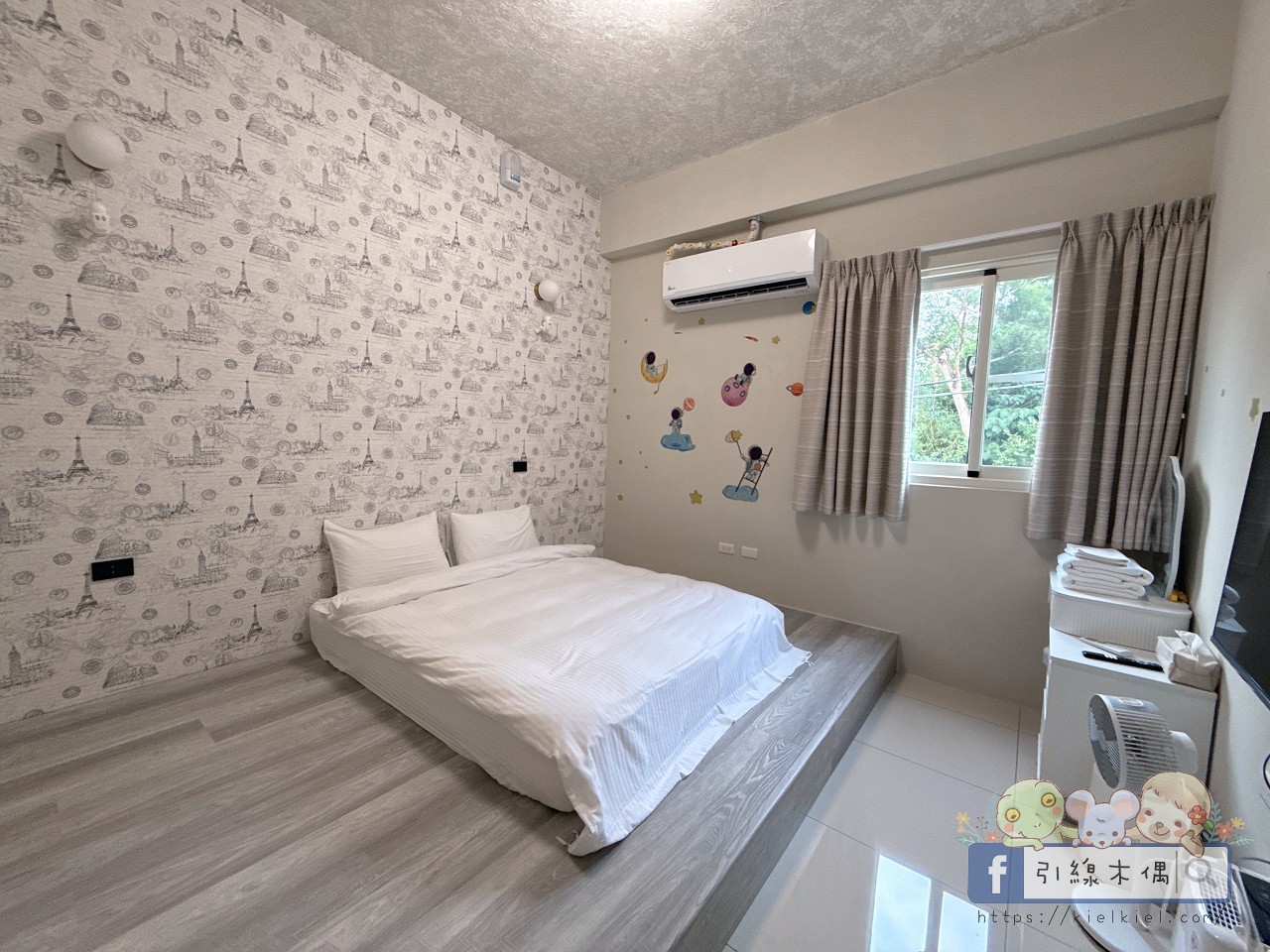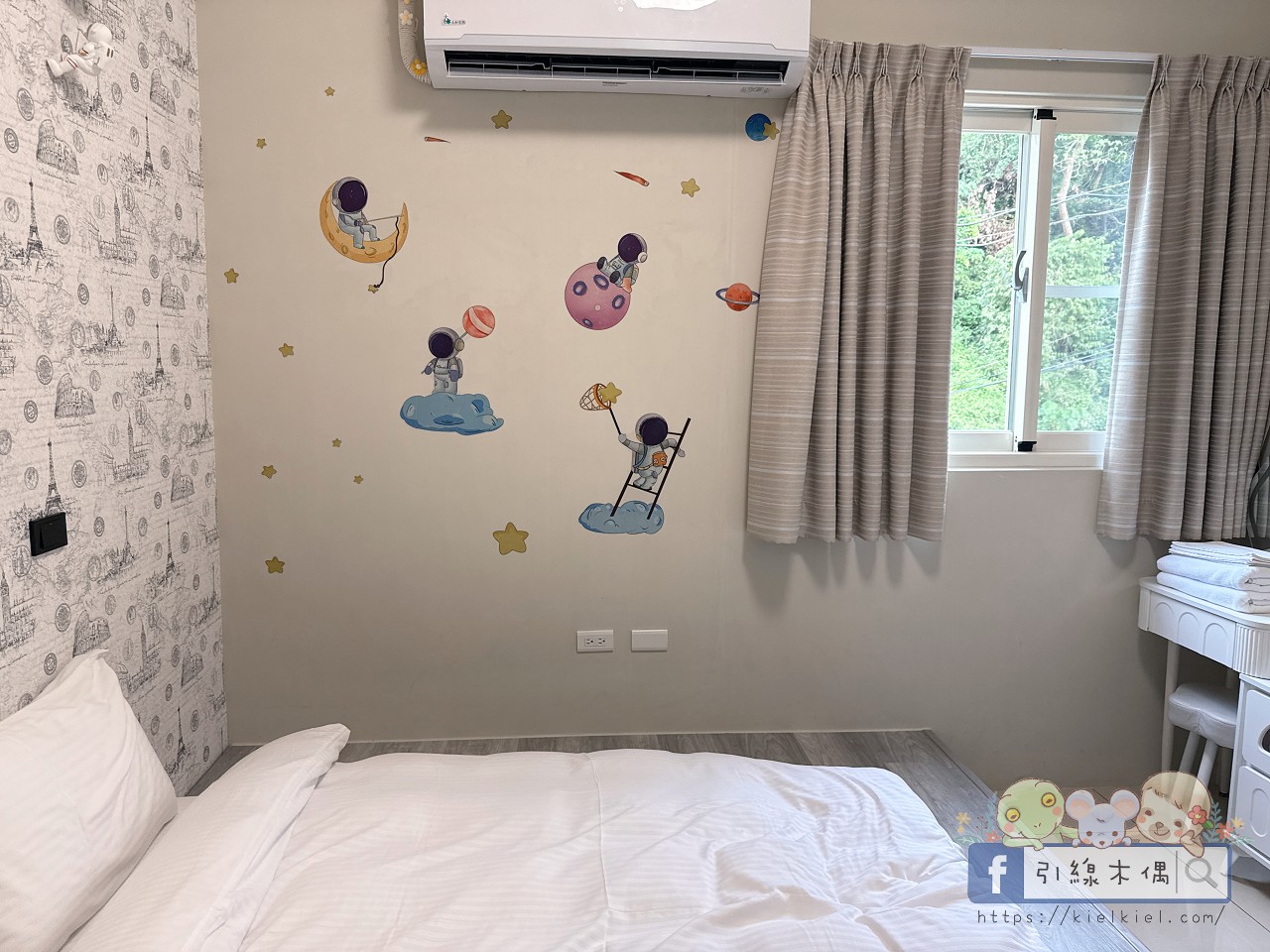 這間房間一打開就被牆上的太空人吸引,好可愛!灰白色調配上童趣的宇航貼紙,讓整體多了一點夢幻感。房間空間滿寬敞的,簡約乾淨,不管是情侶入住還是親子小家庭都很舒服。