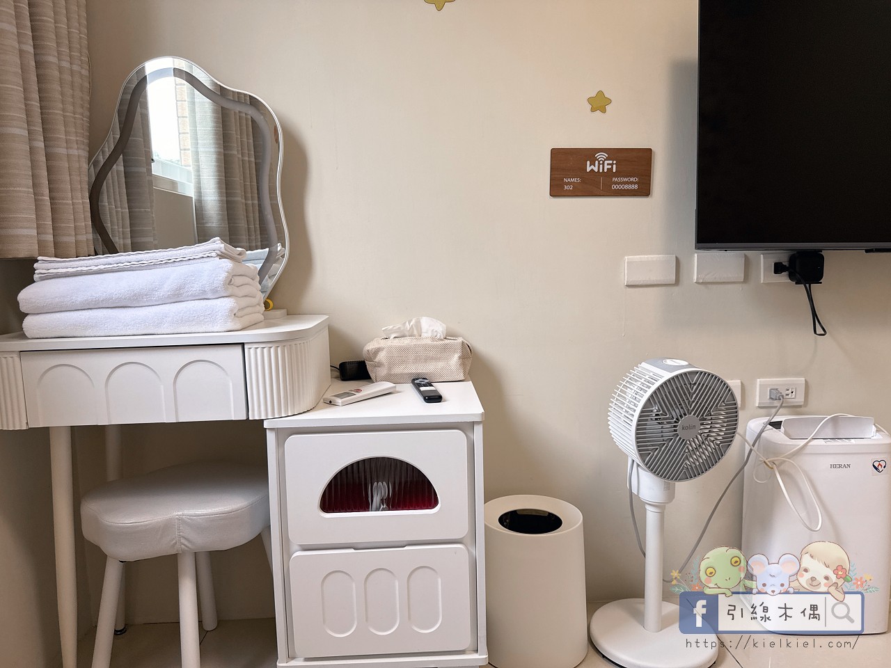 我特別喜歡那個靠窗的位置,外面是滿滿綠意,早上光線剛好灑進來,有一種被山林包圍的安靜感。梳妝台、風扇、小收納櫃都貼心備好,住起來輕鬆沒有壓力。是那種一眼就覺得溫柔、越住越放鬆的房型。
