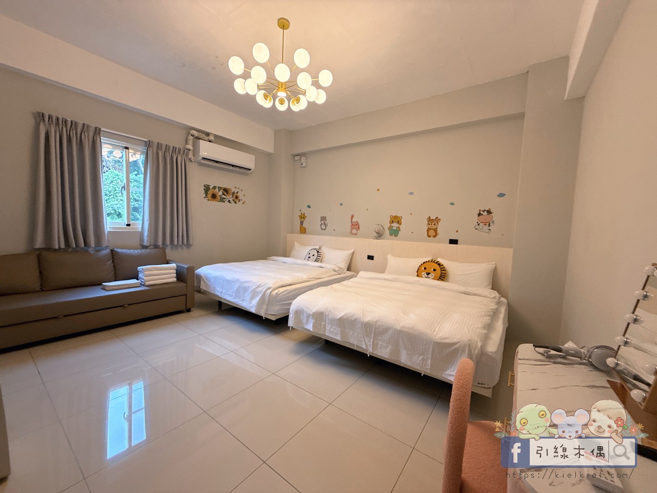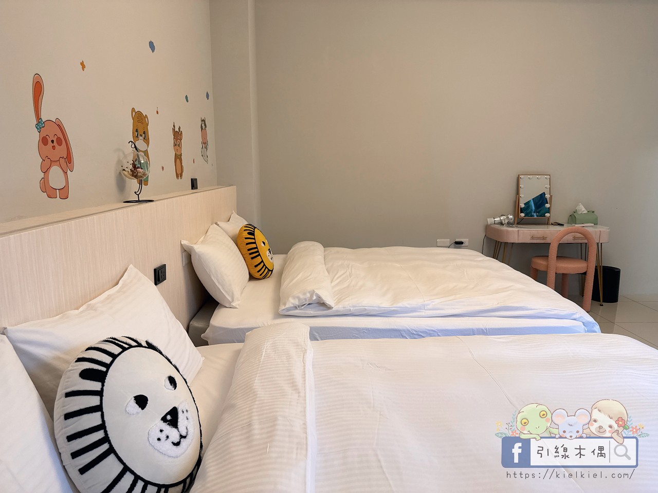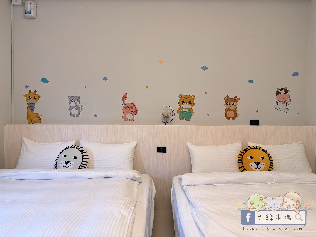 這間是好友一家入住的親子房,第一眼就被那一整排動物壁貼萌到。獅子、兔子、小熊們排排站在床頭,連抱枕都是動物造型,光是這些小細節就讓孩子笑得合不攏嘴。