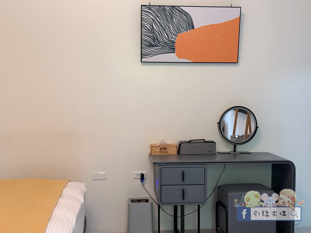 這間202雙人房是我們特別安排給96歲阿祖住的。房間的採光剛剛好,不會太亮,白天自然光柔柔灑進來,晚上又安靜得很適合休息。床鋪軟硬適中,睡起來非常舒服,靠牆的小梳妝台和橘色抽屜櫃也很可愛。