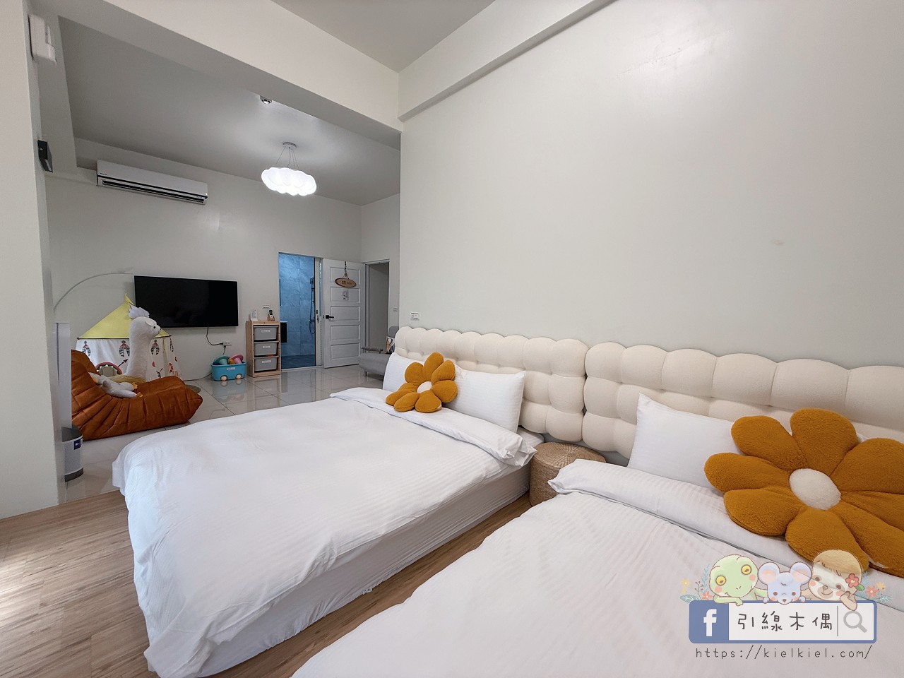 203四人房是我們一家三口這次入住的兒童主戰場,房間超寬敞,除了兩張大床,還有帳篷和幾樣可愛玩具,一進門啾啾就尖叫著說「這是我的秘密基地!」晚上還揪著好友、表兄妹一起跑來玩,笑聲此起彼落,整個變成小孩的天堂。