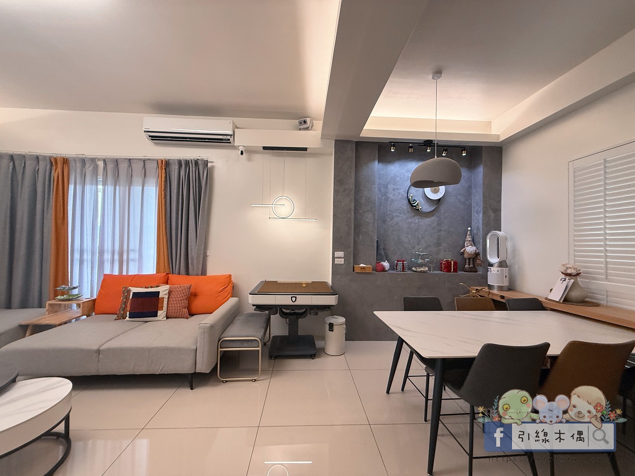 餐桌區緊鄰客廳,延續同樣的簡約現代風格,燈具與掛鐘都能看出主人的巧思。空間裡留白充足,不擁擠、很好拍,也方便家人團聚、朋友聚餐。夜晚大家窩在沙發上看風景、聊天,氣氛溫柔又自在,讓人不自覺地想多待一會。
