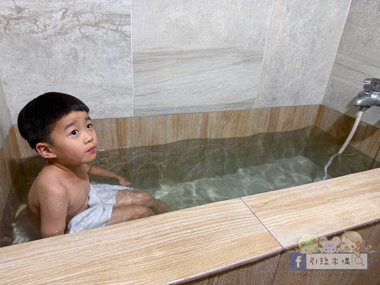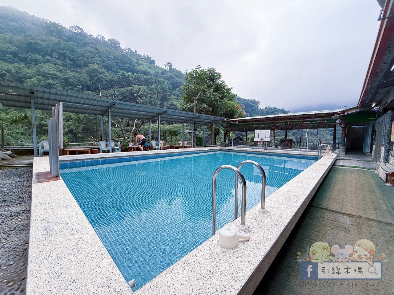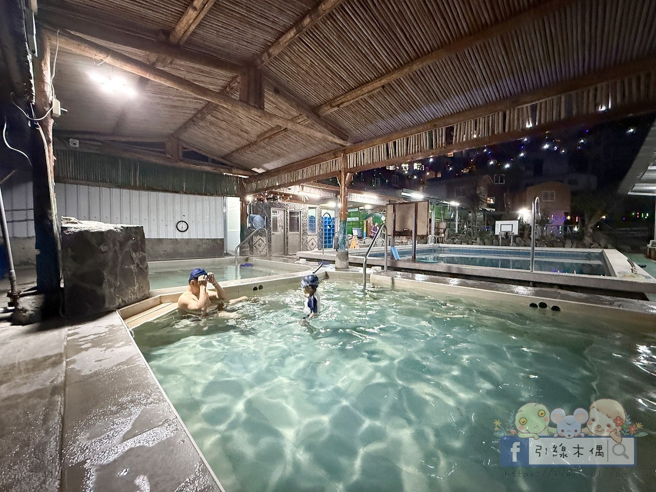 《東光行旅》是弱鹼性碳酸泉,水質清澈乾淨、沒有刺鼻的硫磺味,泡完皮膚會滑滑的,有三種池,冷池、熱池與大型泳池,空間寬敞得啾啾都能在裡面游上一圈。