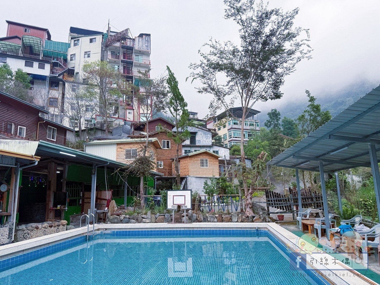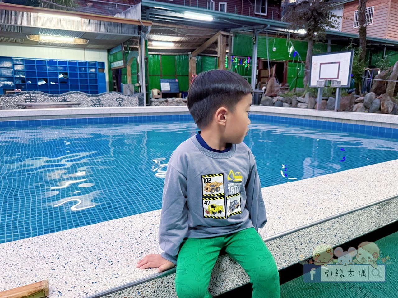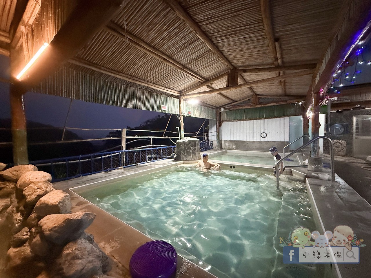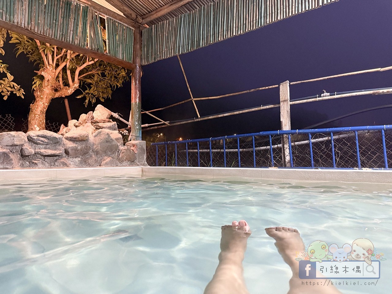 《東光行旅》是弱鹼性碳酸泉,水質清澈乾淨、沒有刺鼻的硫磺味,泡完皮膚會滑滑的,有三種池,冷池、熱池與大型泳池,空間寬敞得啾啾都能在裡面游上一圈。