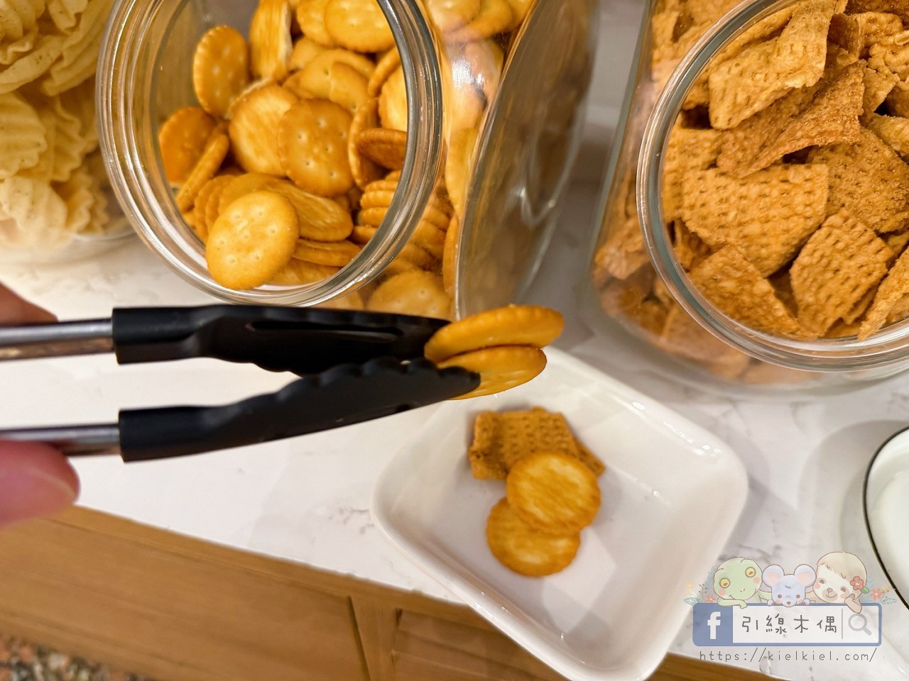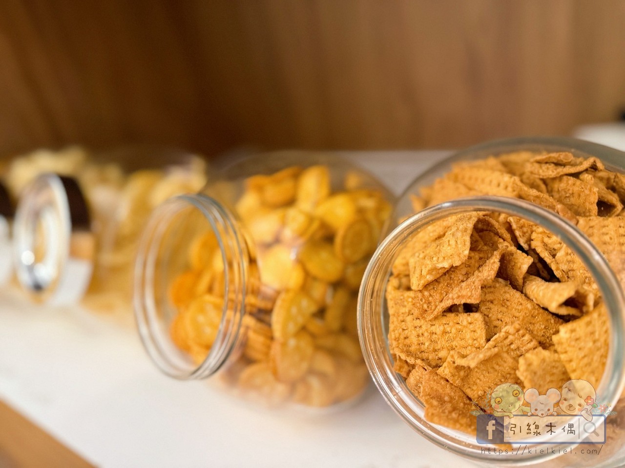 抵達當天的午後,旅館的交誼區貼心準備下午茶。桌上提供餅乾、茶包與現煮咖啡,簡單、乾淨、舒服。工作人員提到,若當天散客較多,還會加碼提供炸物或甜點,讓旅客在入住後就能先暖暖胃、補充能量。交誼區的氛圍安靜放鬆,啾啾坐在木椅上啃著餅乾,整個空間慢慢沉入午後獨有的緩慢節奏。