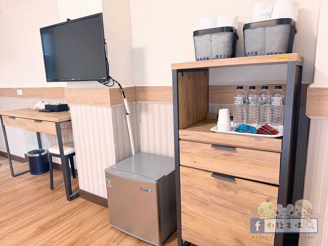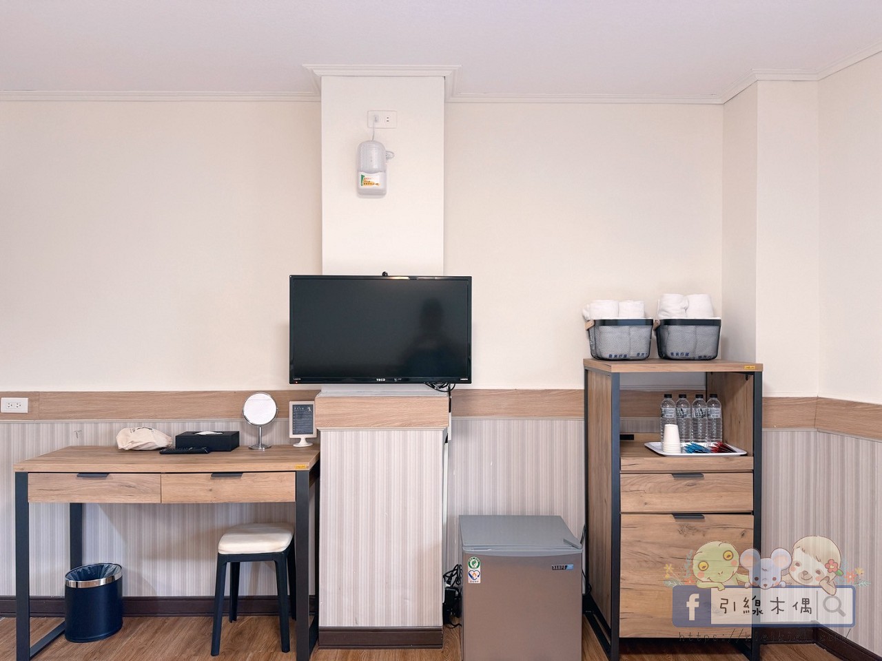桌面與收納空間都很實用,礦泉水、茶包、毛巾整齊地擺放在木櫃上,小冰箱與電視也一應俱全。大片窗景望出去是山色與雲霧,不用特別開燈,午後自然光灑進來就很溫柔。