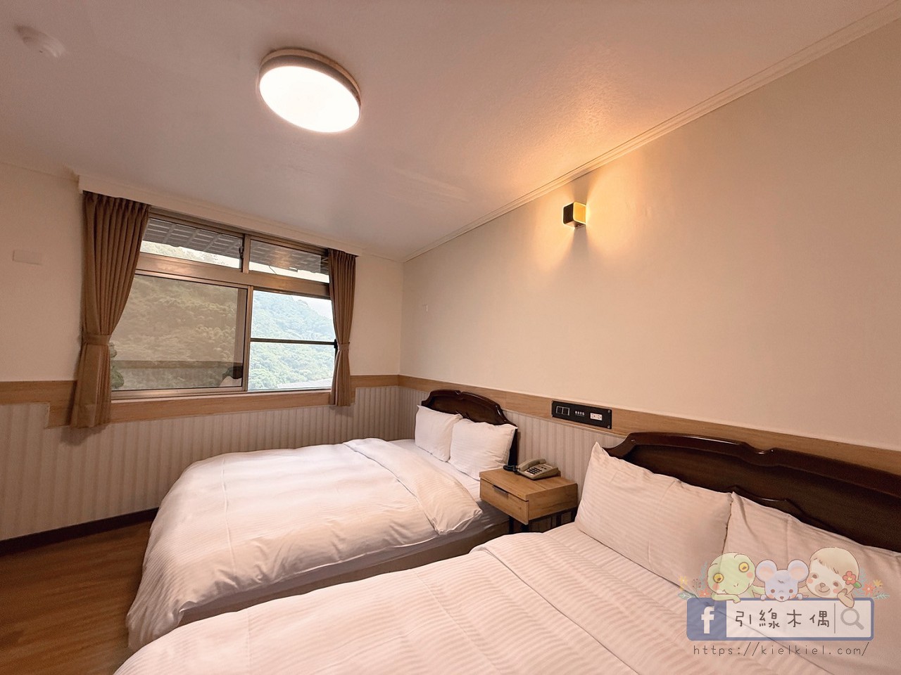 我們這次住的是四人房,兩張大床軟硬適中,連啾啾都一覺到天亮。夜裡泡完湯再鑽回被窩,那份暖意一路延伸到夢裡。每間房都附有獨立冷暖空調與足夠的插座,細節設想到位,住起來特別自在。