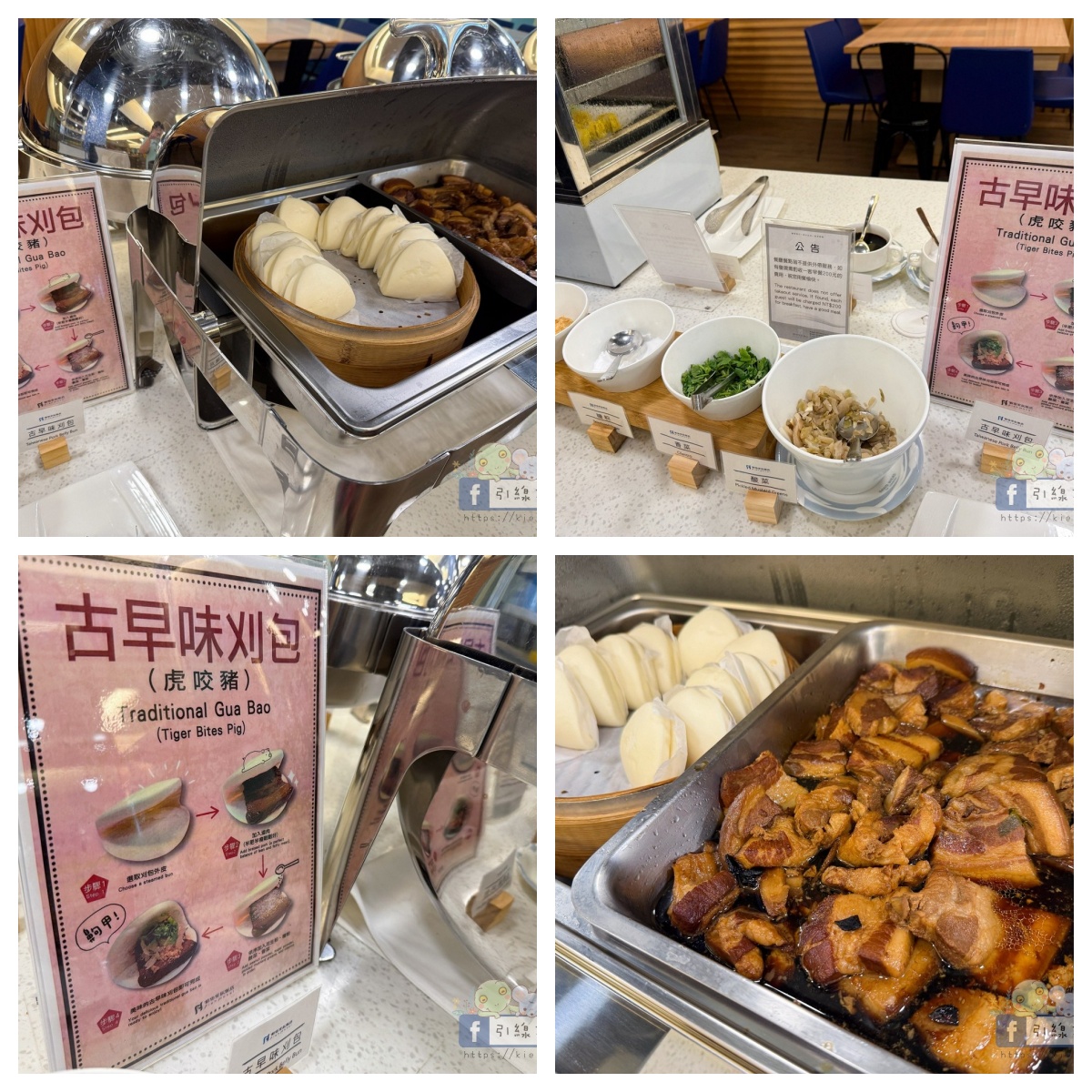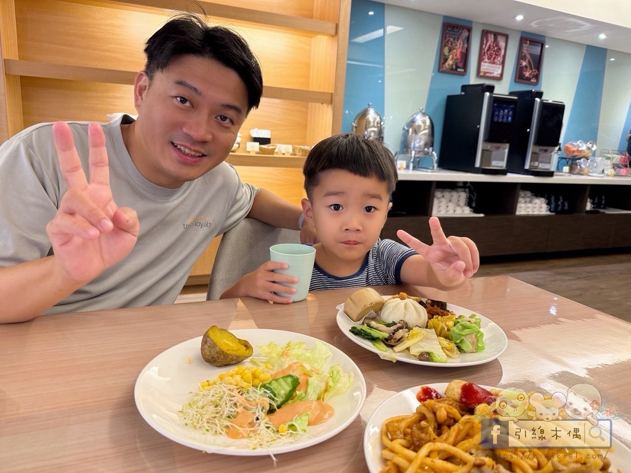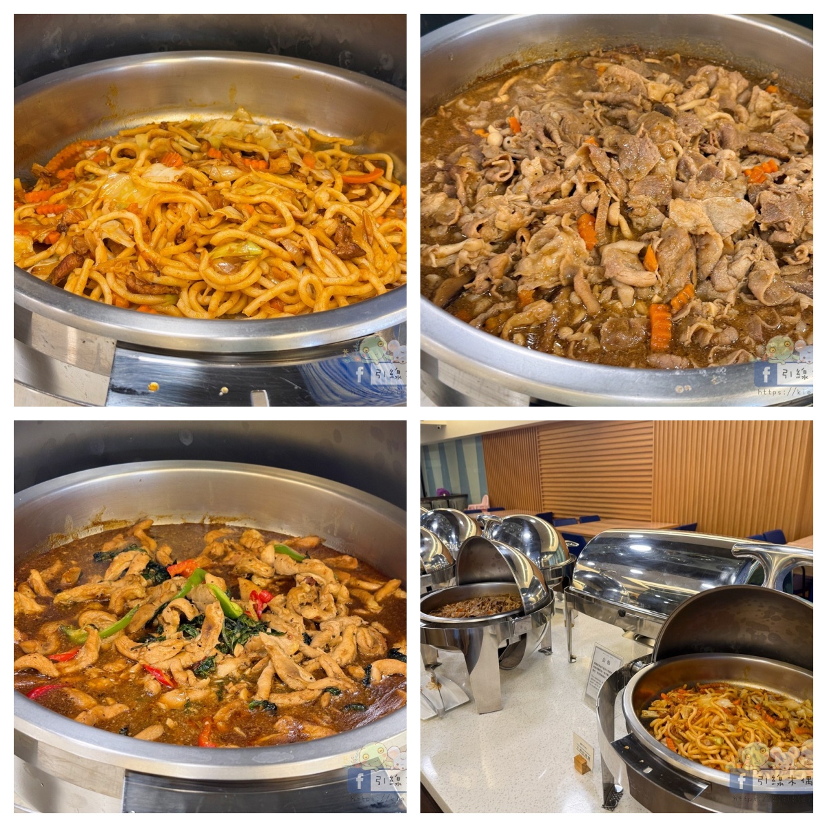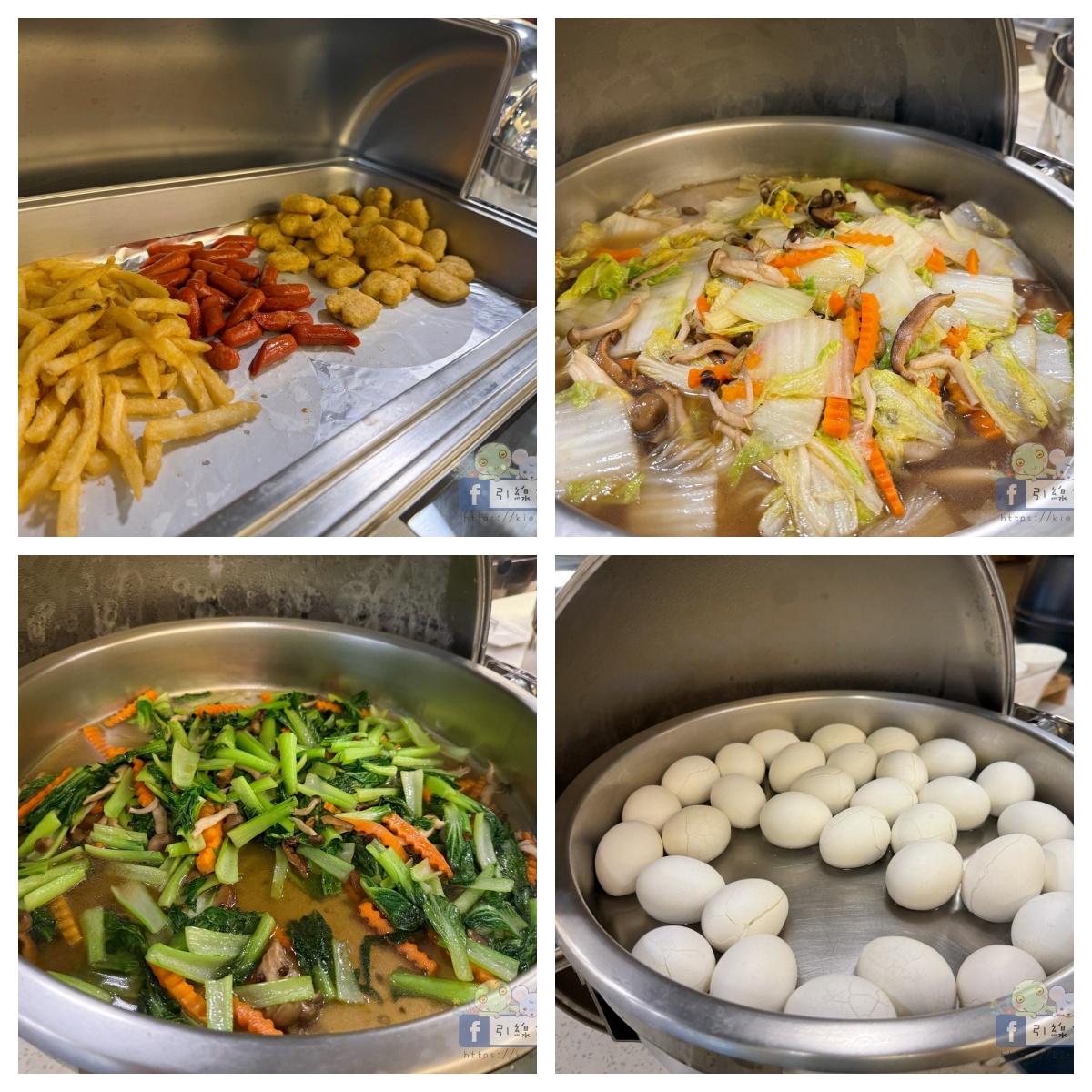 早晨的餐廳瀰漫著溫暖香氣,擺滿了熱炒、蒸物與粥品。炒麵、塔香雞柳、日式豚肉輪流上場,蒸籠裡冒著白霧的饅頭與蒸餃讓人食慾大開。還有水果沙拉、牛乳穀片、咖啡果汁,選擇豐富得像在開一場盛宴。啾啾最喜歡炸物區的薯條與雞塊,而我則默默鎖定那個散發著古早香氣的刈包台。
