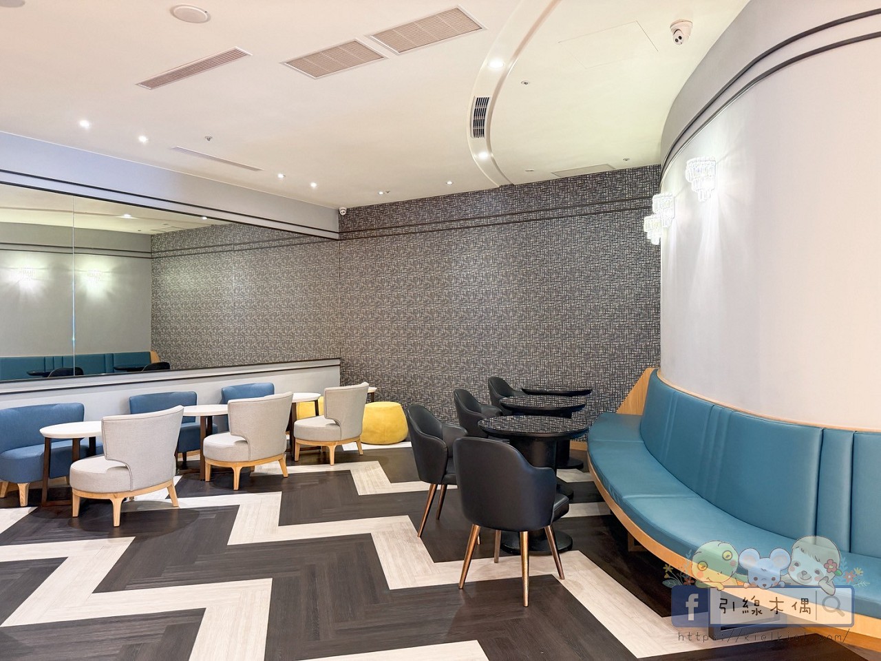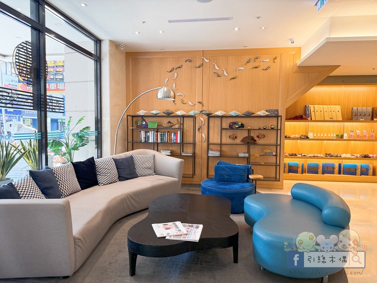 沙發區是我最喜歡的一角。柔軟的米灰與湖藍色沙發搭配金屬燈架與木質牆面,既有設計感也讓人放鬆。牆上細緻的魚群裝飾輕巧地游動於視覺之中,讓整個空間彷彿藏著海的故事。角落還有書架與幾個創意小物,細節之間透露著飯店的趣味與品味。