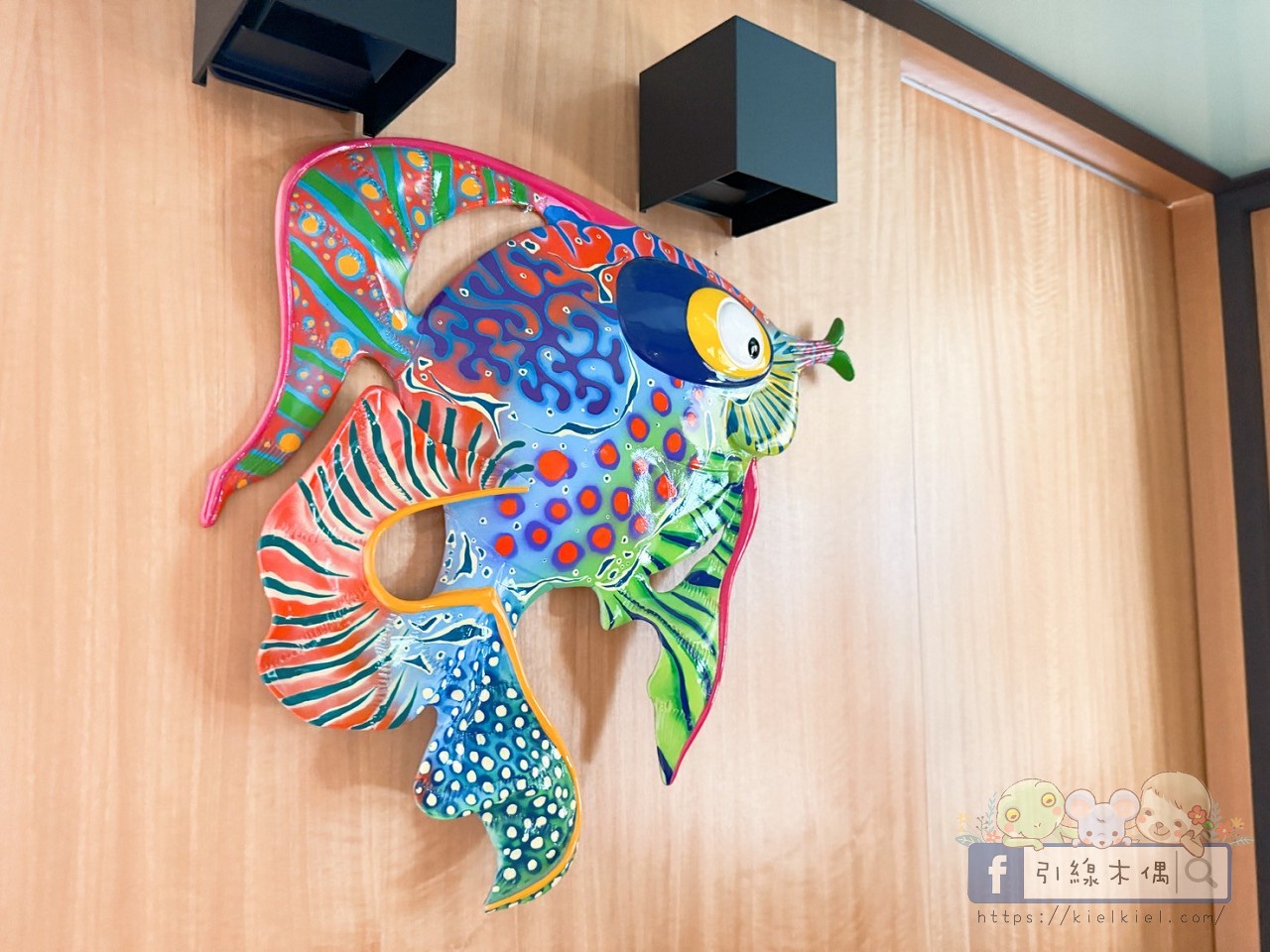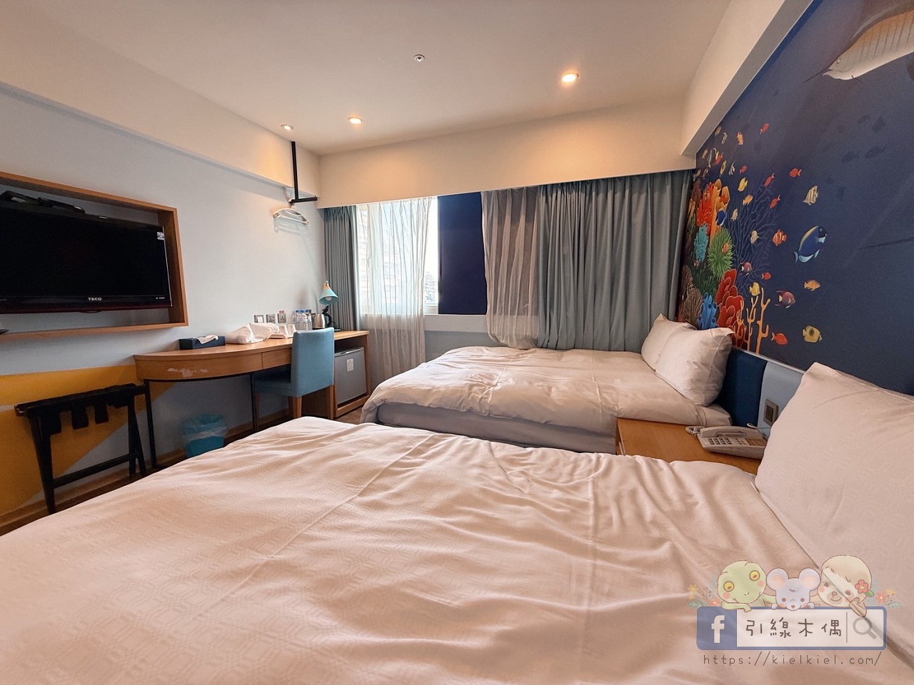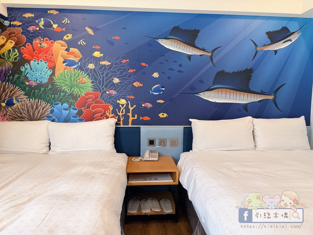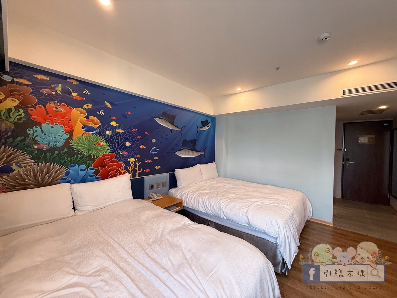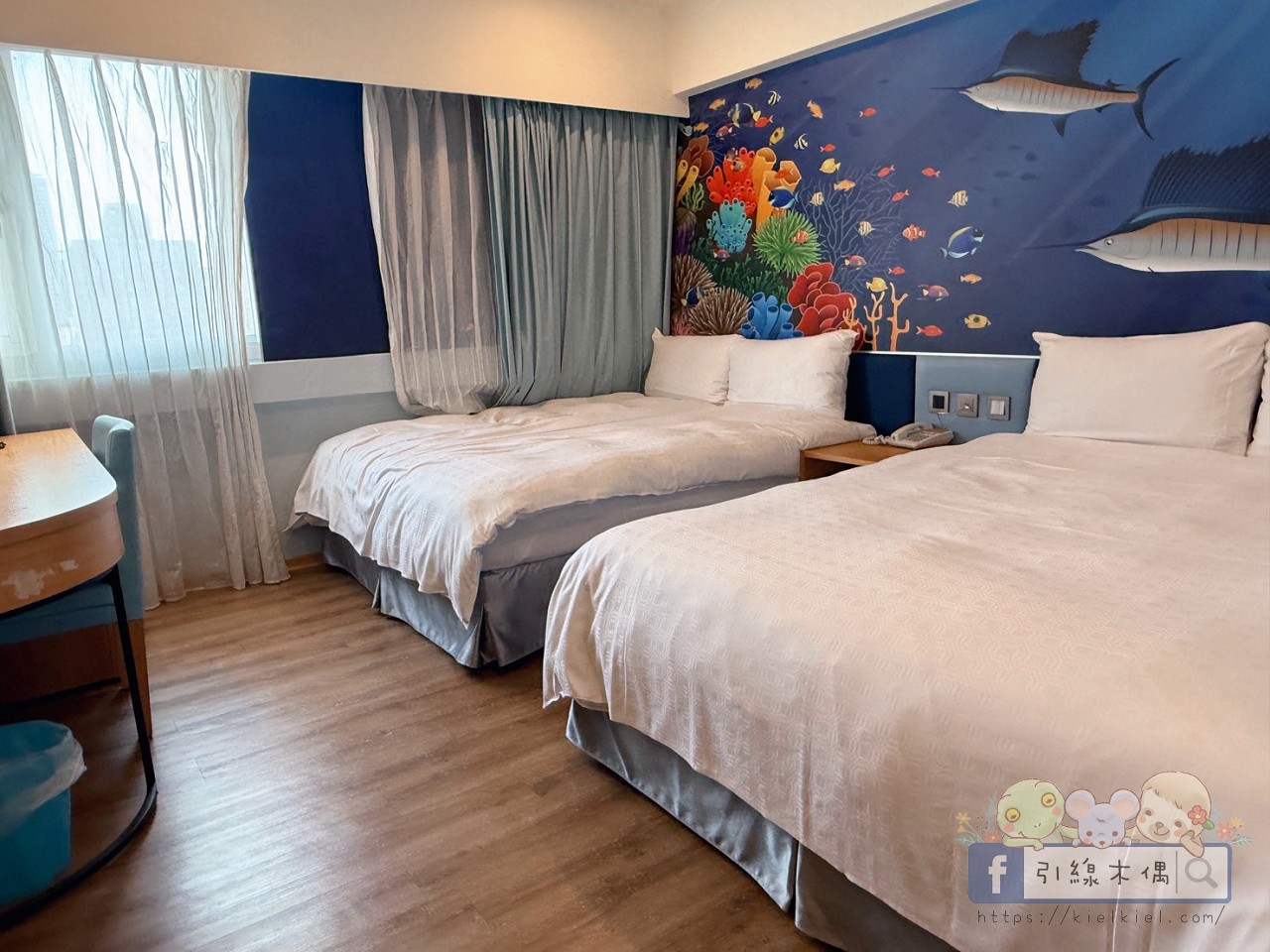 我們入住的是「童趣四人房」。推開門的瞬間,那面深藍色的海洋牆立刻成為主角,魚群、珊瑚與旗魚在牆上悠游,整個房間像被海浪包圍般寧靜。木質地板與柔軟床鋪讓人一進來就想放鬆,窗邊透進自然光,讓空間更顯明亮。